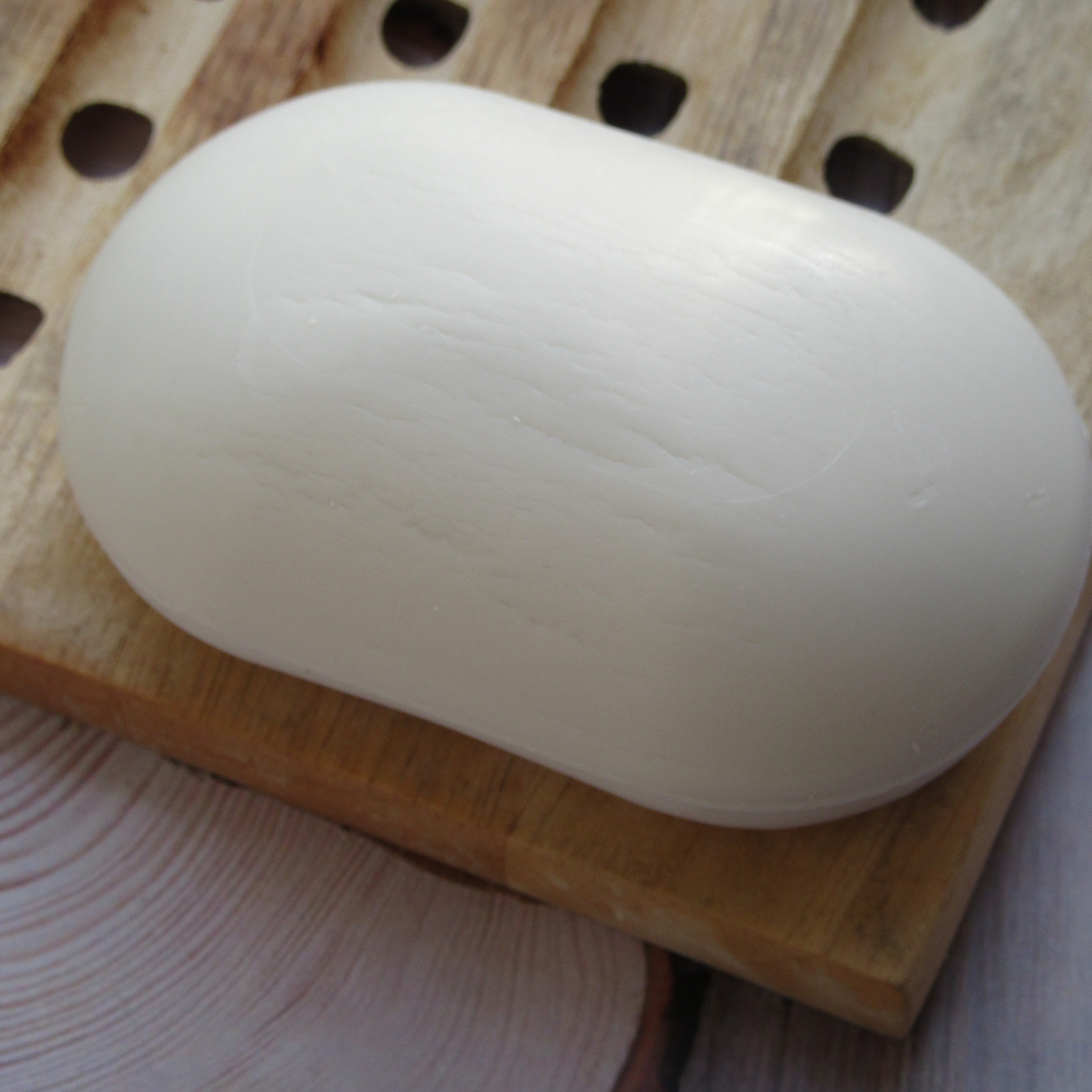 Мыльце вполне увесистое, 100 граммов. Без каких-либо рисунков или логотипа - просто молочно-белый брусок с гладкими краями.