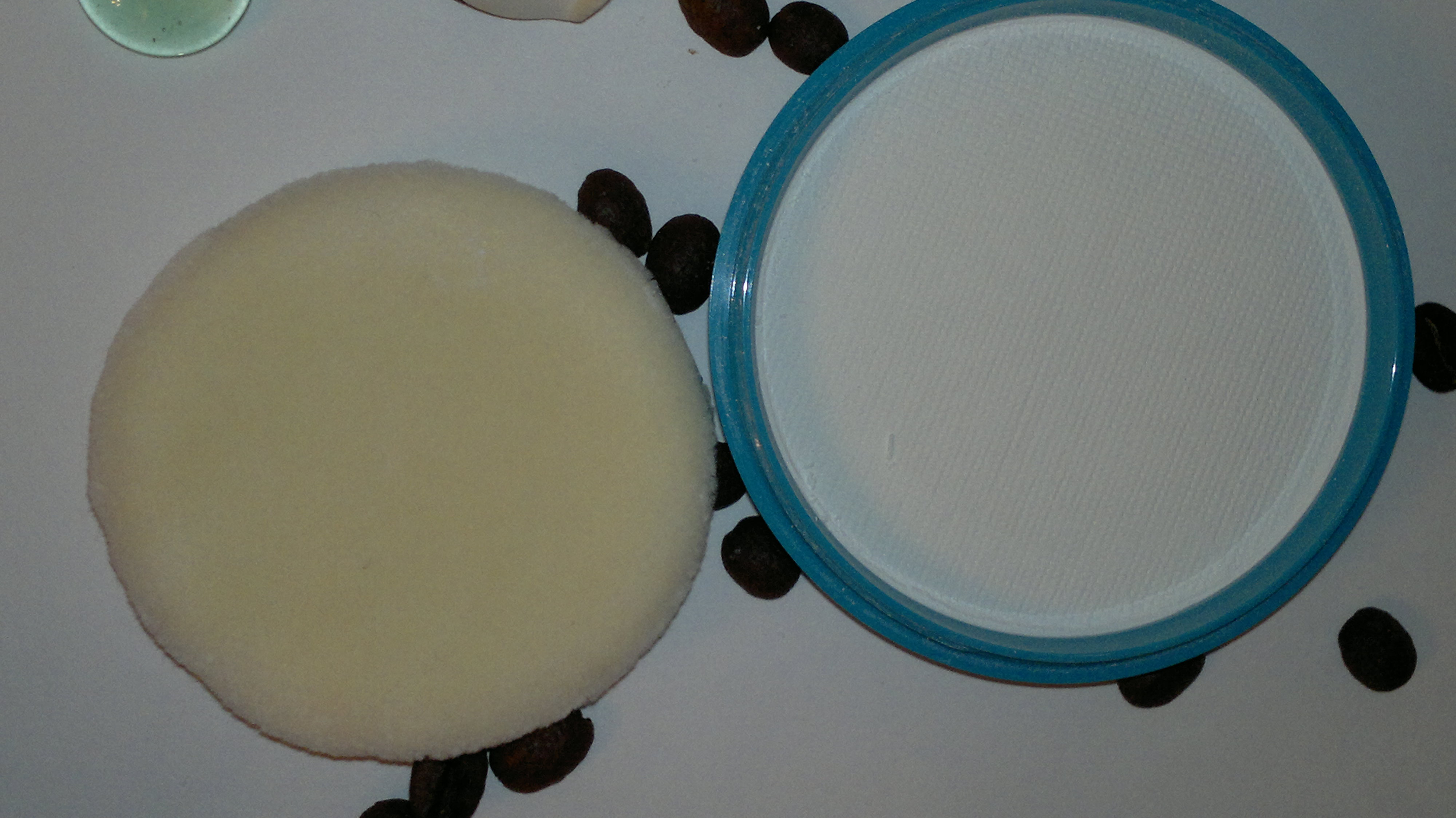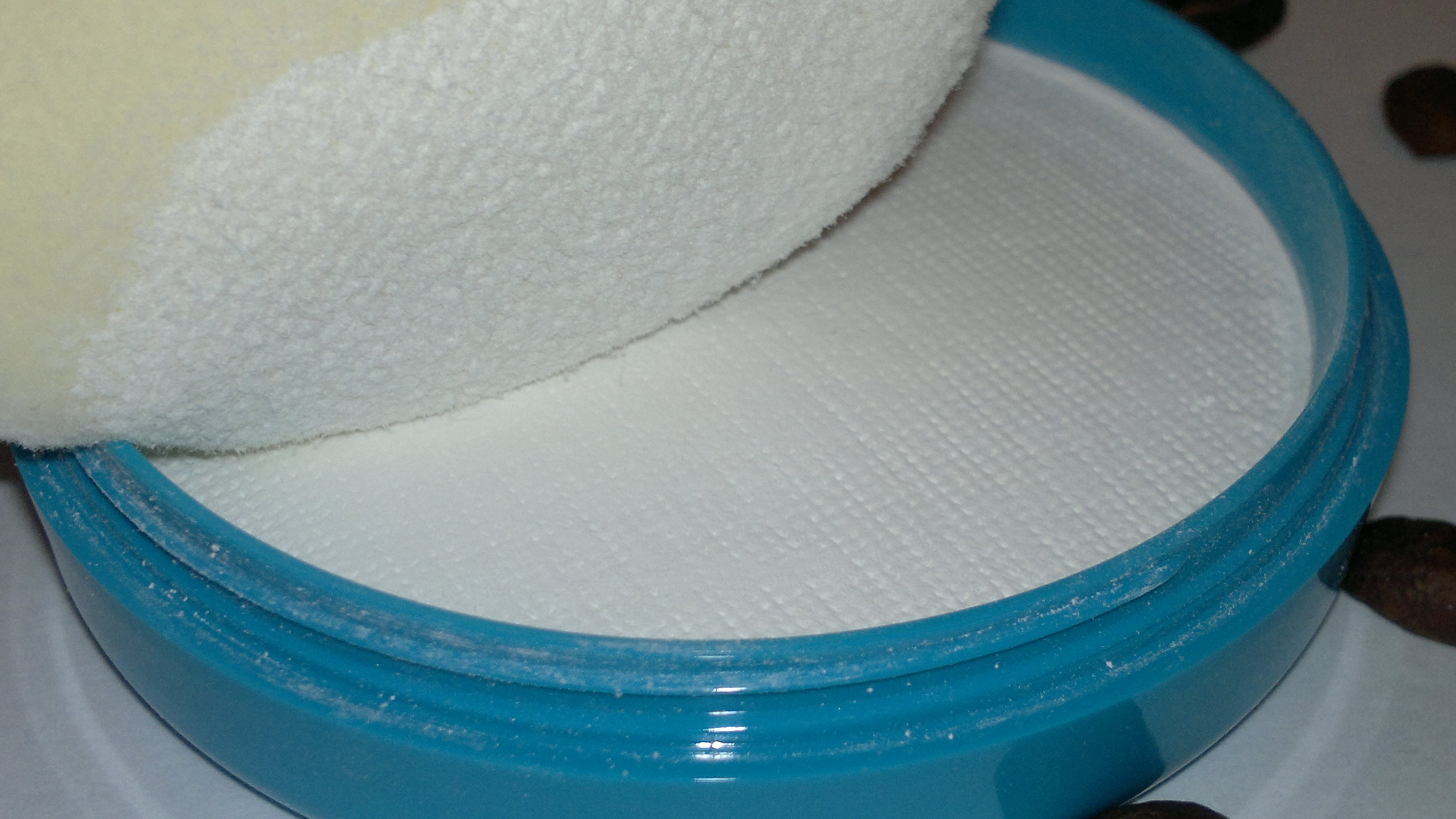 Пудра находится в круглой шайбочке, из очень плотного пластика. Вверх белый, низ нежно голубой. Крышка откручивается и плотно закручивает. Под ней пуховка, спонджиком это сложно назвать. Очень уж нежная, но и качественная. Изготовлена на тканной основе с мягким ворсом. Есть кармашек для пальчиков, что бы было удобнее держать)
