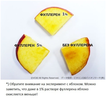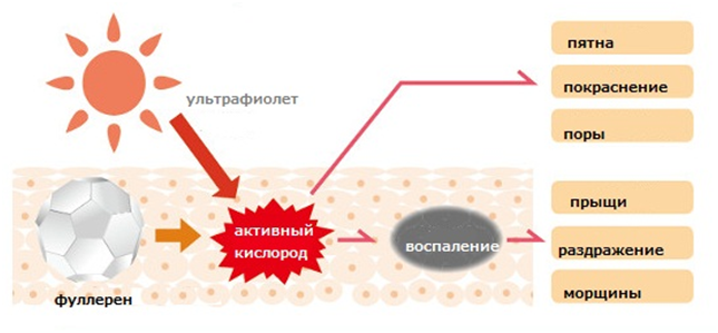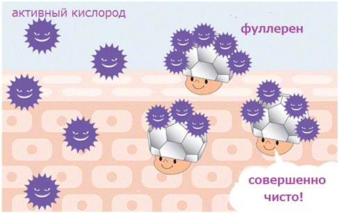 Фуллерены являются мощнейшими антиоксидантами, известными на сегодняшний день, за это их обожают японские косметологи. В среднем они превосходят действие всех известных до них антиоксидантов в 100—1000 раз. Кроме того фуллерен – антиоксидант продолжительного действия.