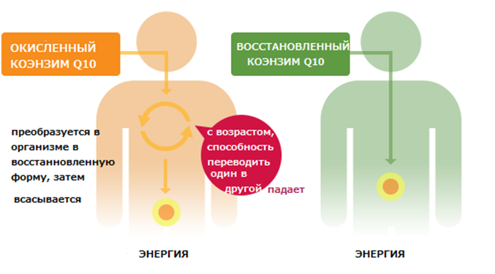 Коэнзим Q10 существует в трёх редокс формах, полностью окисленной (убихинон), частично восстановленный (семихинон или убисемихинон) и полностью восстановленный (убихинол). Применение восстановленной формы коэнзима Q10 более эффективно, чем использование его окисленной формы, так как она обладает в 8 раз большей тканевой биодоступностью, чем окисленная.