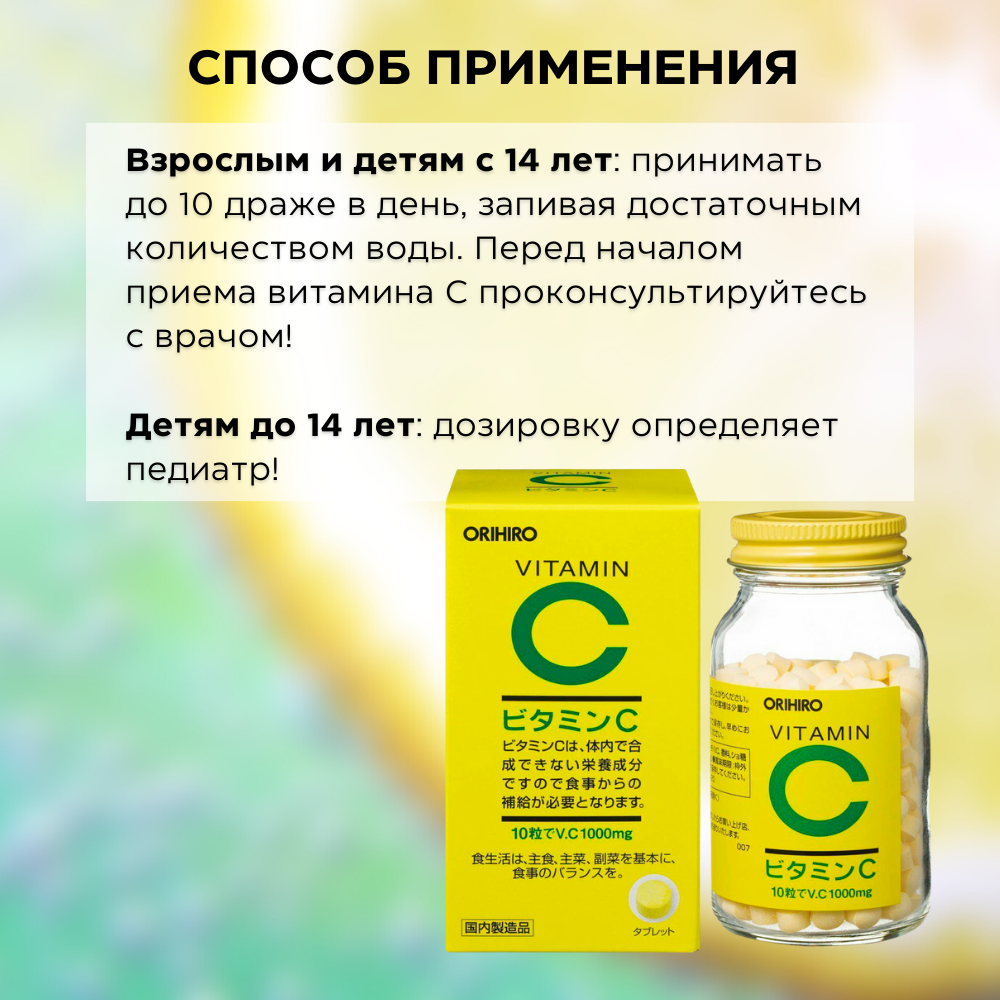Пищевая ценность (10 таблеток): Витамин С 1000 мг, белки 0 г, жиры 0,06 г, углеводы 2,6 г.