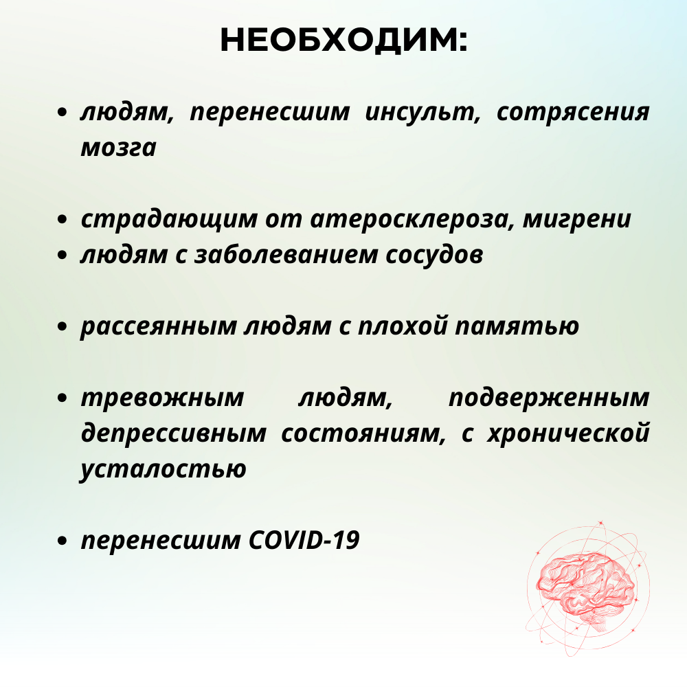 - Снижает риск возникновения инфарктов, инсультов и их осложнений, показан при ощущении шума в ушах, головокружении, мигрени и даже при рассеянном склерозе.