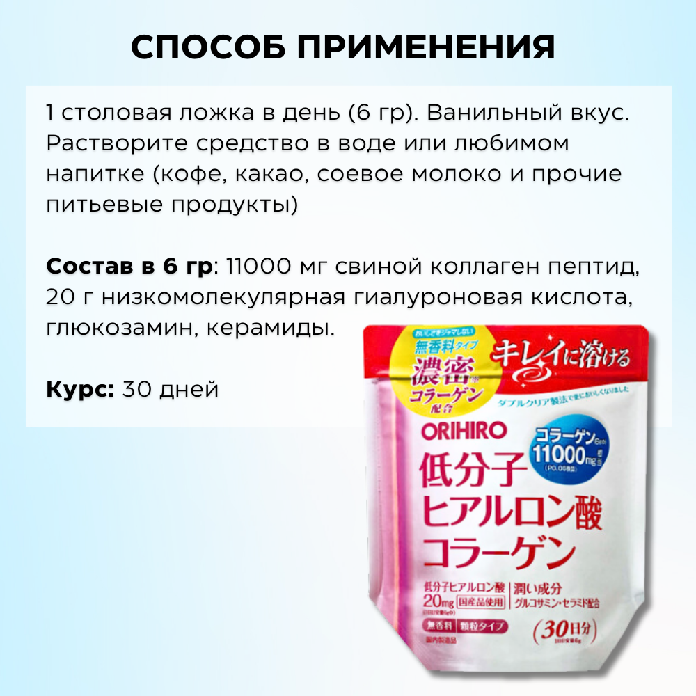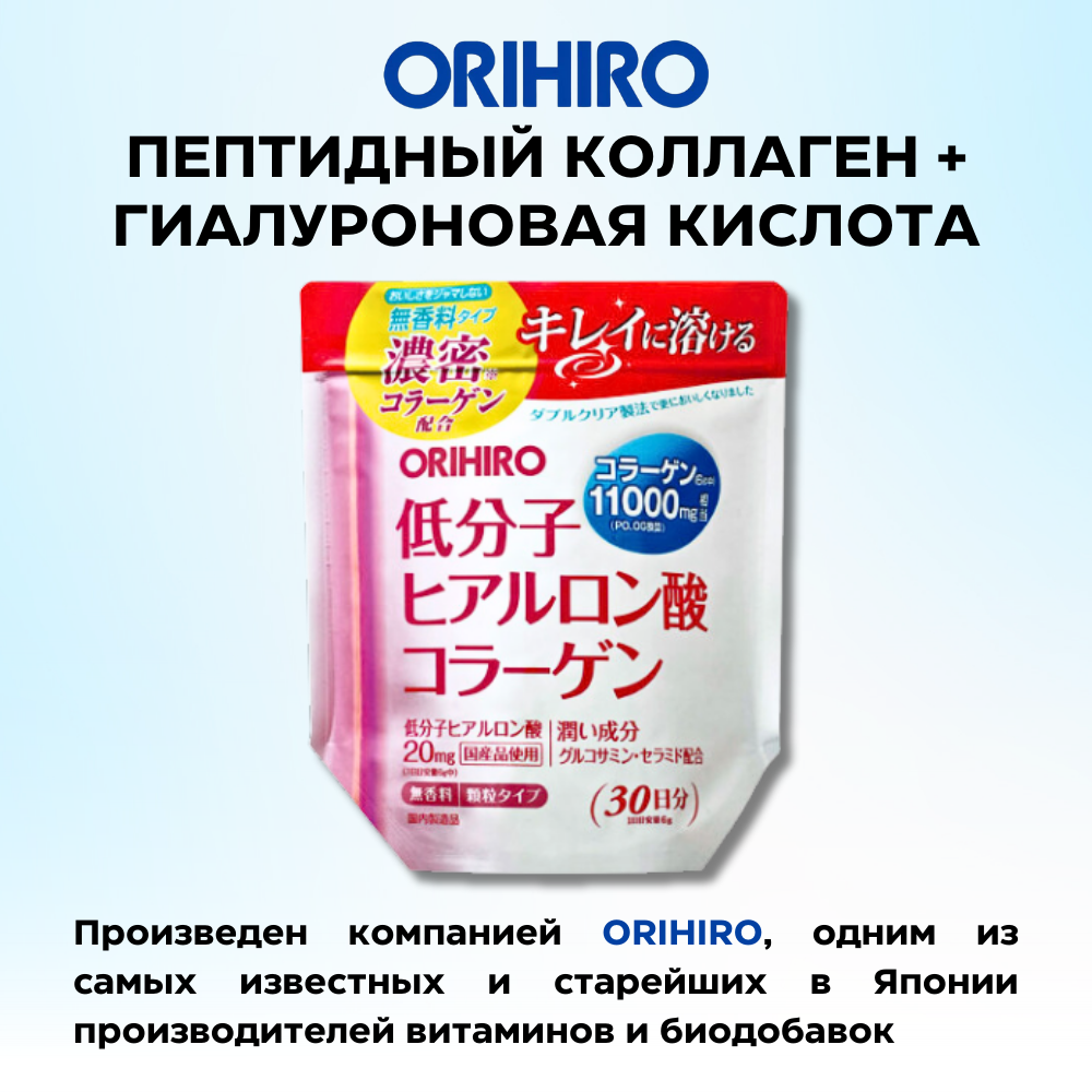 Описание товара: ORIHIRO Плотный коллаген + низкомолекулярная гиалуроновая кислота, 180 гр на 30 дней.