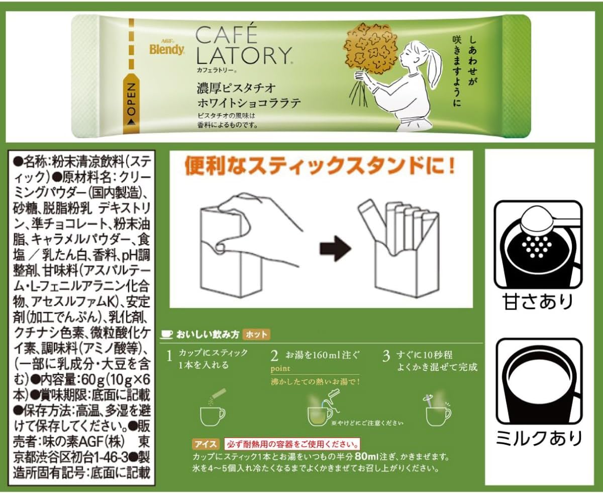 Описание товара: AGF Blendy Cafe LATORY Rich Pistachio White Chocolate Latte Фисташковый латте в стиках, 6 шт