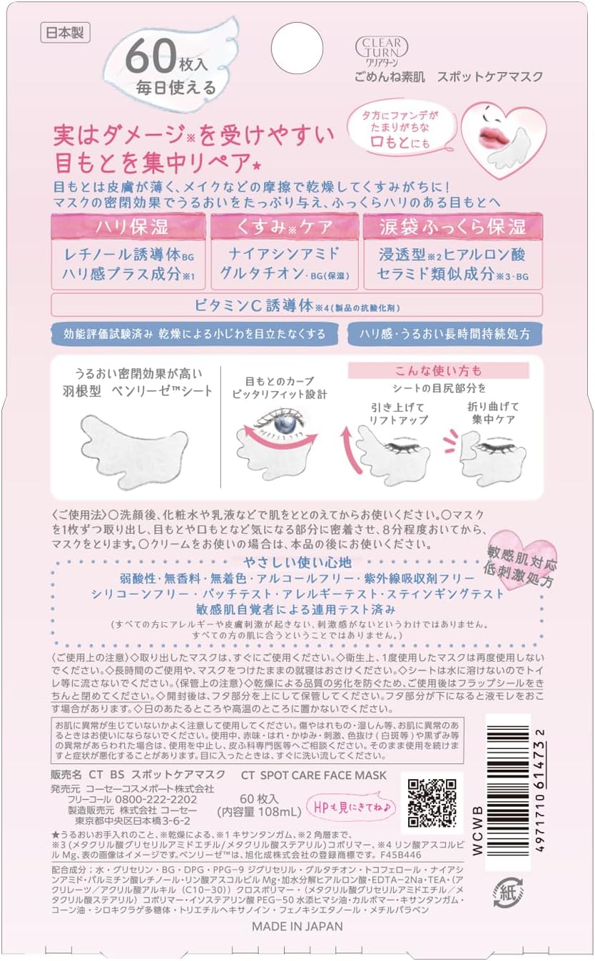 Kose Cosmeport Clear Turn Spot Care Face Mask - патчи для интенсивного восстановления кожи вокруг глаз, склонной к перенапряжению и мелким морщинкам. Идеальна для восстановления яркого взгляда для уставших глаз, после работы за компьютером или после долгого трудного дня.Эта тканевая маска обеспечивает интенсивное увлажнение, делая кожу более упругой и подтянутой. Мягко воздействует на нежную кожу вокруг глаз благодаря лучшим компонентам и отсутствию балластных вредных веществ.