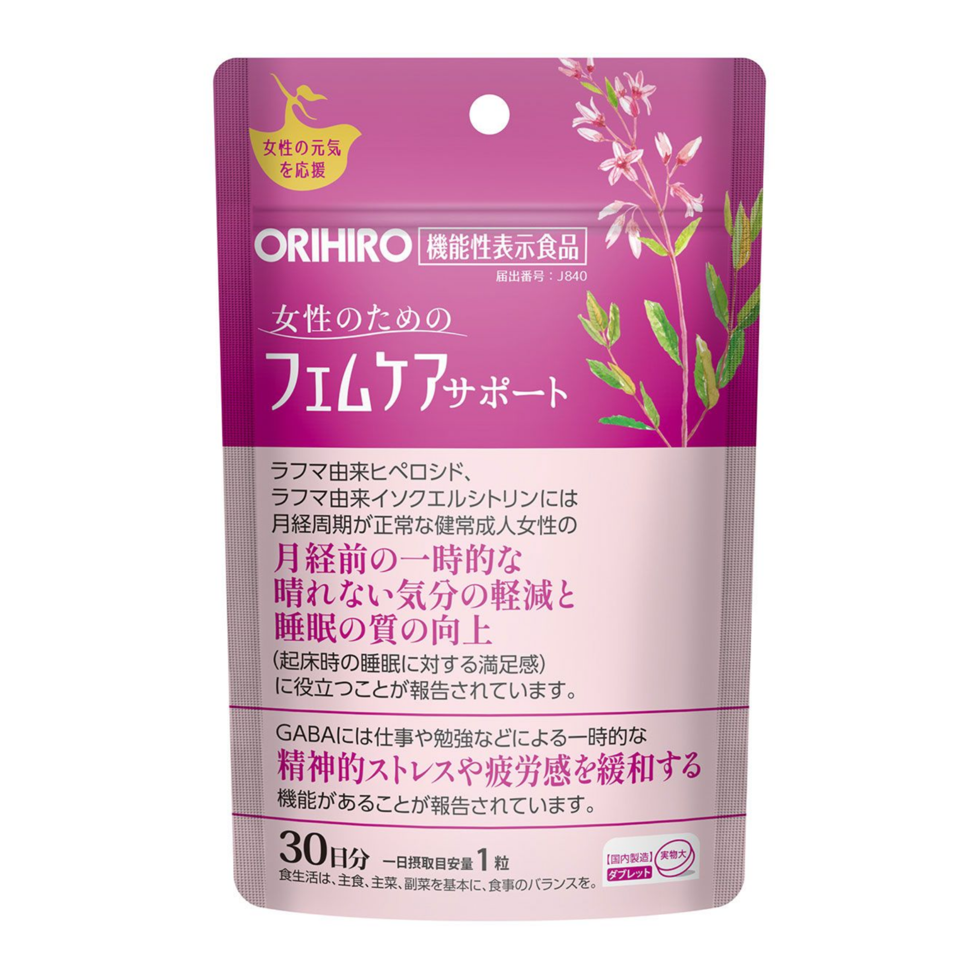 ORIHIRO Femcare Support - препаарт, созданный с заботой о женском самочувствии. Этот продукт содержит три активных ингредиента: гиперозид, полученный из растения Apocynum venetum, изокверцитрин, полученный из Apocynum venetum, и ГАМК. Они выполняют две функции: гиперозид и изокверцитрин помогают облегчить временную предменструальную депрессию, эмоциональное истощение и перенапряжение, улучшить качество сна у здоровых взрослых женщин с регулярным менструальным циклом, в то время как ГАМК помогает облегчить временное психическое напряжение и упадок сил, вызванные внешними стрессами и усталостью.