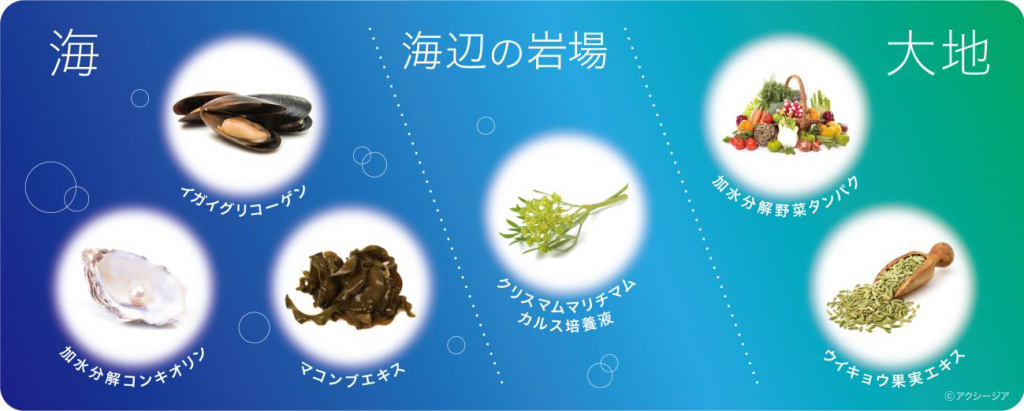 Состав: Вода, диметикон, сквалан, масло виноградных косточек, гиалуронат натрия, культуральный раствор chrysmum marithimamucarus, гликоген мидий, гидролизованная гиалуроновая кислота, экстракт корня солодки, ацетилтирозин, пролин, гидролизованный растительный белок, экстракт плодов фенхеля, гидролизованный конхиолин, маннитол, экстракт ламинарии, ацетилгексапептид-1, гексапептид-2, олигопептид-1, аскорбиновая кислота.