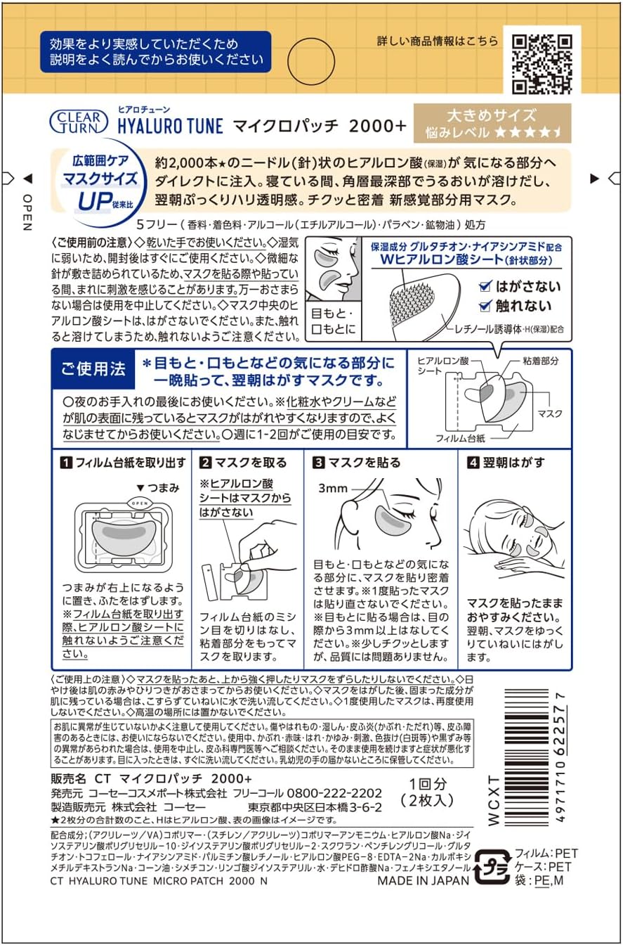 Kose Cosmeport Clear Turn Hyaluro Tune - ультрасовременный уход за кожей с помощью патчей с микроиглами с гиалуроновой кислотой, которые обеспечивают мощный увлажняющий уход за кожей. Используйте его на участках, где вас беспокоит сухость, например, вокруг глаз и рта.