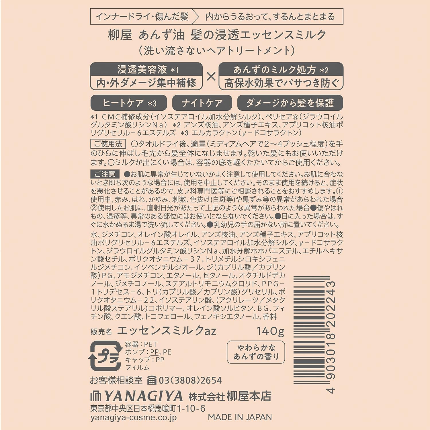 Yanagiya Apricot Oil Hair Essence Milk is a moisturizing weightless hair milk based on natural apricot oil.The essence milk, created on the basis of a highly moisturizing formula with three apricot components, has a high penetrating power and intensively restores dry and damaged hair, making it smooth and moisturized.