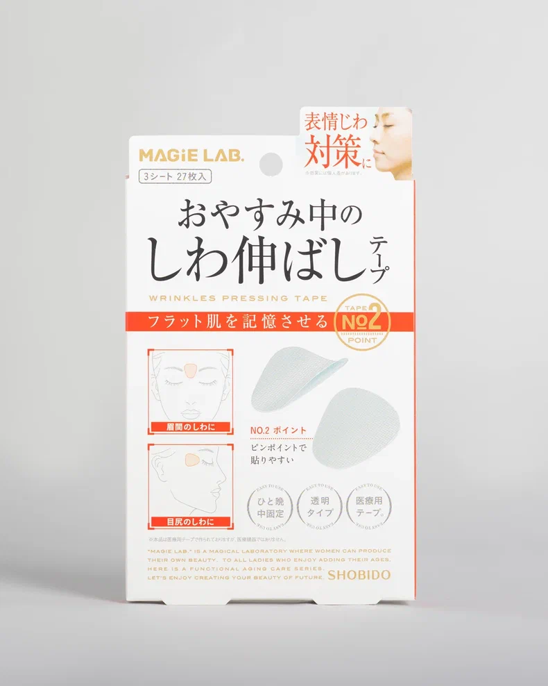 MAGiE LAB Wrinkle Stretching teips are thicker elastic patches that need to be glued before bedtime on problem areas of the skin. Teip based on a medical tape reliably fixes muscles in a relaxed state and prevents swelling of the skin during sleep, smoothes wrinkles.