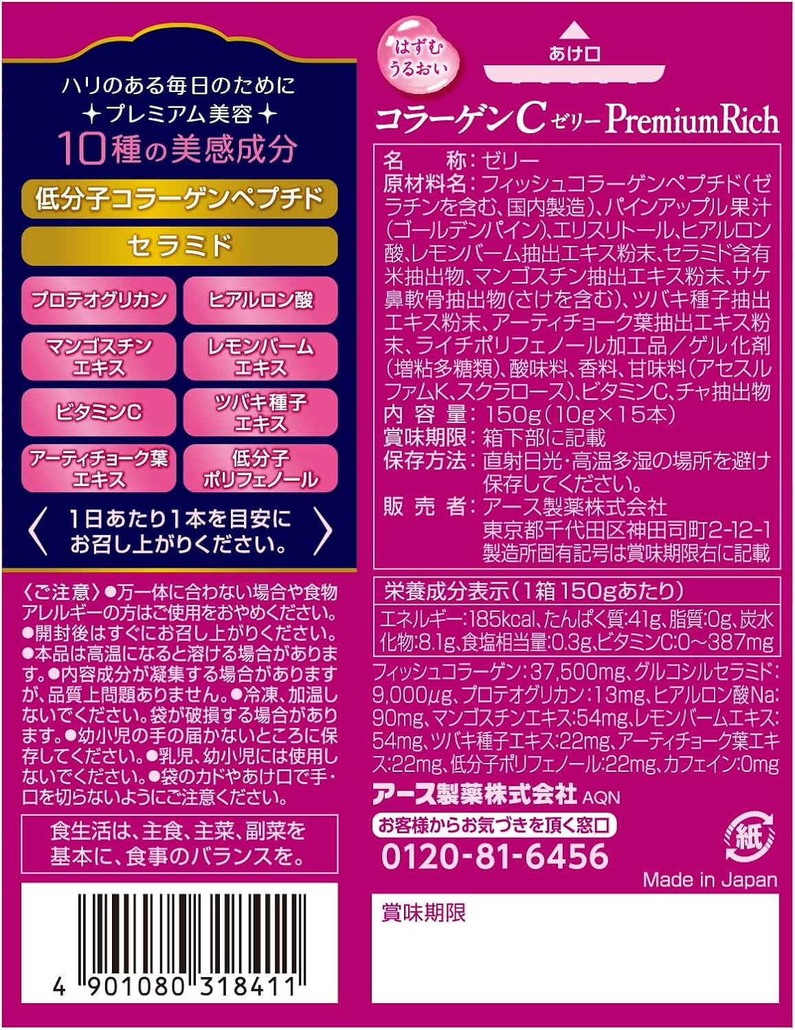 Fish Collagen peptide (contains gelatin, made in Japan), pineapple juice (golden pineapple), erythritol, hyaluronic acid, lemon balm extract powder, rice extract containing ceramides, mangosteen extract powder, salmon nasal cartilage extract (includes salmon), camellia seed extract powder, artichoke leaf extract powder, processed lychee polyphenols, gelling agent (polysaccharide thickener), acidity regulator, flavor, sweetener (acesulfame‑K, sucralose), vitamin C, tea extract.How to accept